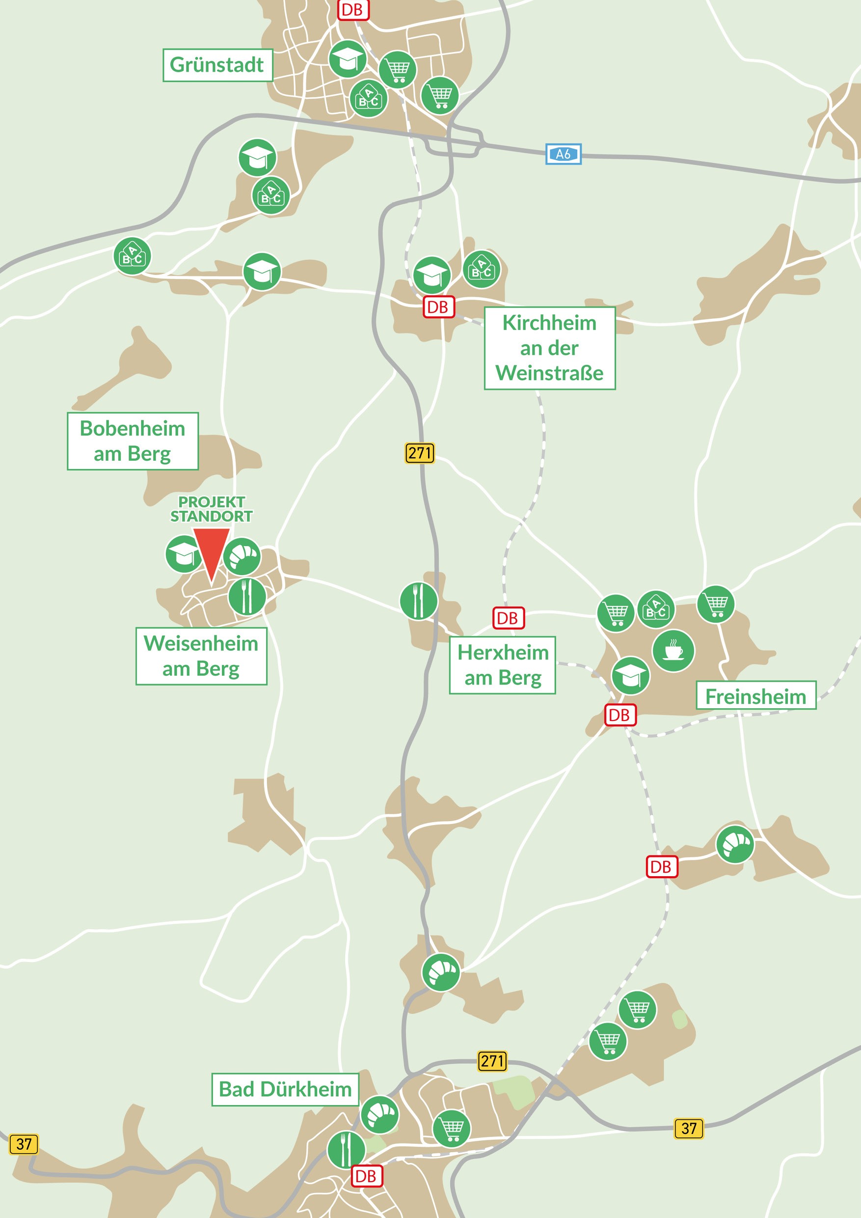 Eine sichere, kinderfreundliche Umgebung sowie Bildungseinrichtungen wie Kita, Grund- und Realschule plus machen Weisenheim zum idealen Wohnort für Familien. Der Alltag gestaltet sich dank Bäcker, Bank, Apotheke und Ärzten ganz unkompliziert. Im nahegelegen Bad Dürkheim finden Sie zusätzliche Einkaufsmöglichkeiten, und falls Sie ein bisschen Großstadtleben suchen, ist die Metropolregion Rhein-Neckar mit Mannheim und Heidelberg auch nicht weit. Weisenheim bietet für jeden etwas!